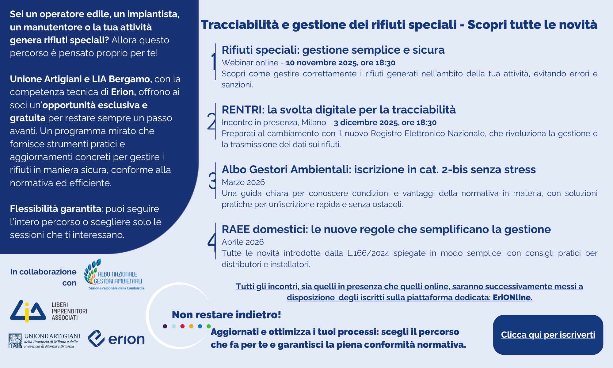 Unione Artigiani di Milano e LIA Bergamo, con la competenza tecnica di Erion ed in collaborazione con la Sezione Lombardia dell'Albo Gestori Ambientali, offrono ai soci un’opportunità esclusiva e gratuita: un programma mirato che fornisce strumenti pratici e aggiornamenti concreti per gestire i rifiuti in maniera sicura e conforme alla normativa.